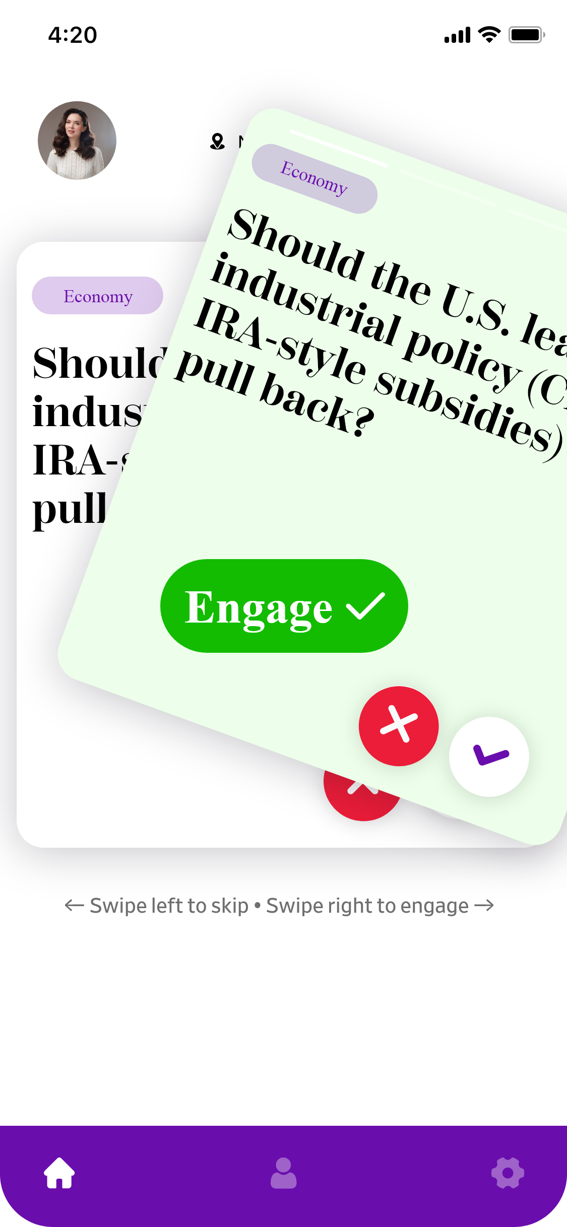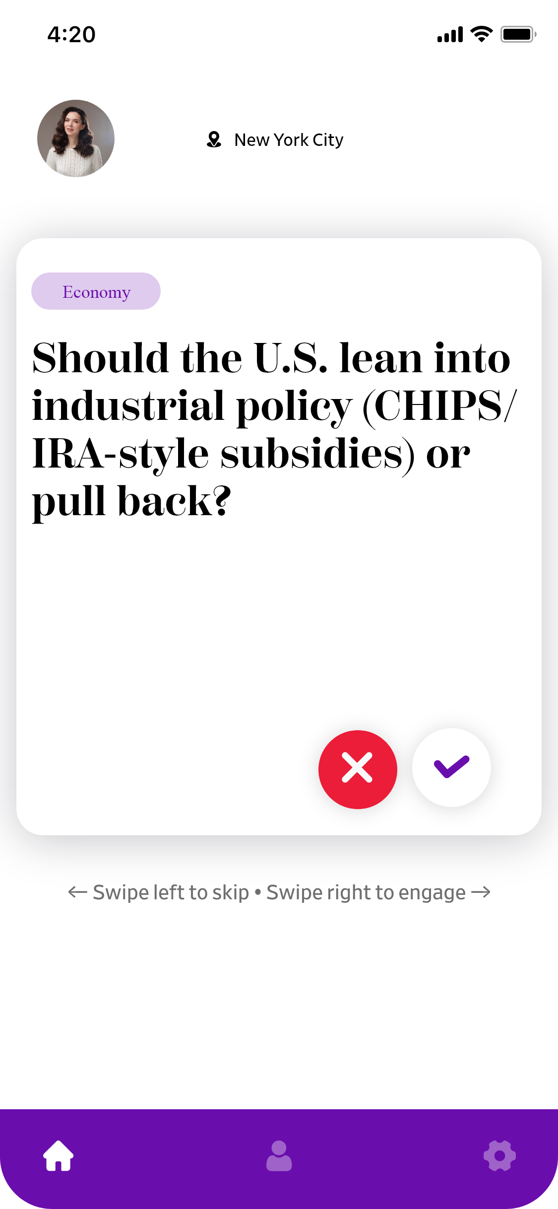The user’s experience will revolve around selecting a daily prompt to read, with a simple yes/no swipe feature allowing the user to decide on a topic for their daily prompt