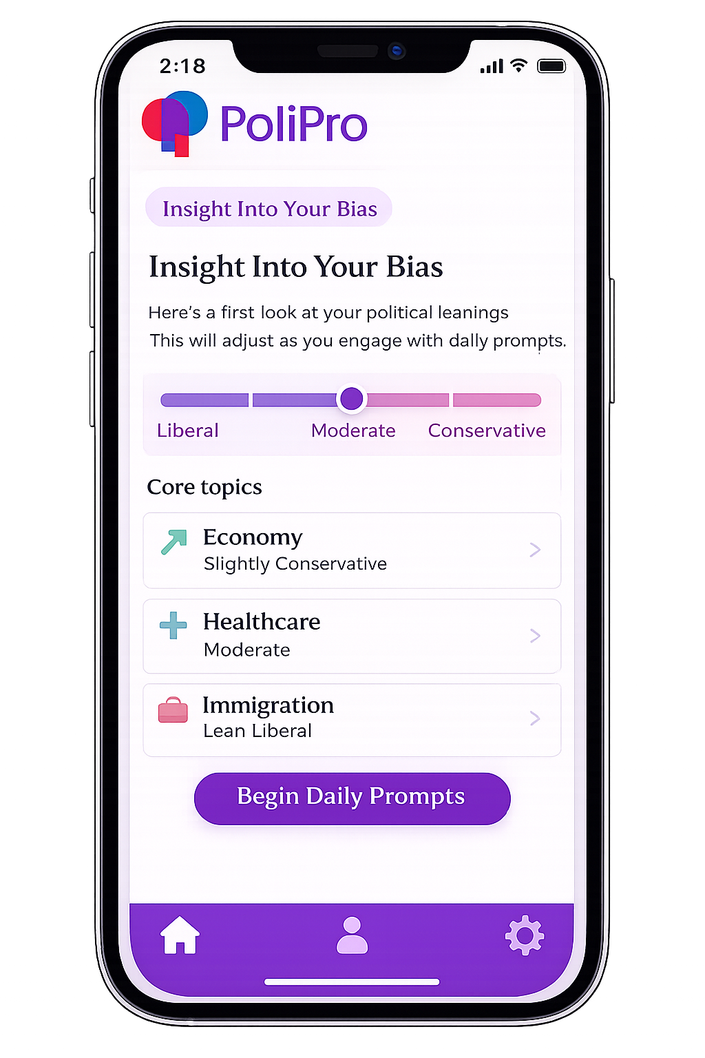 The Entry Quiz is a short onboarding assessment that helps users understand where they currently stand across key political issues. In just a few minutes, it generates a starting Bias Report that frames their perspective going into the daily prompts.