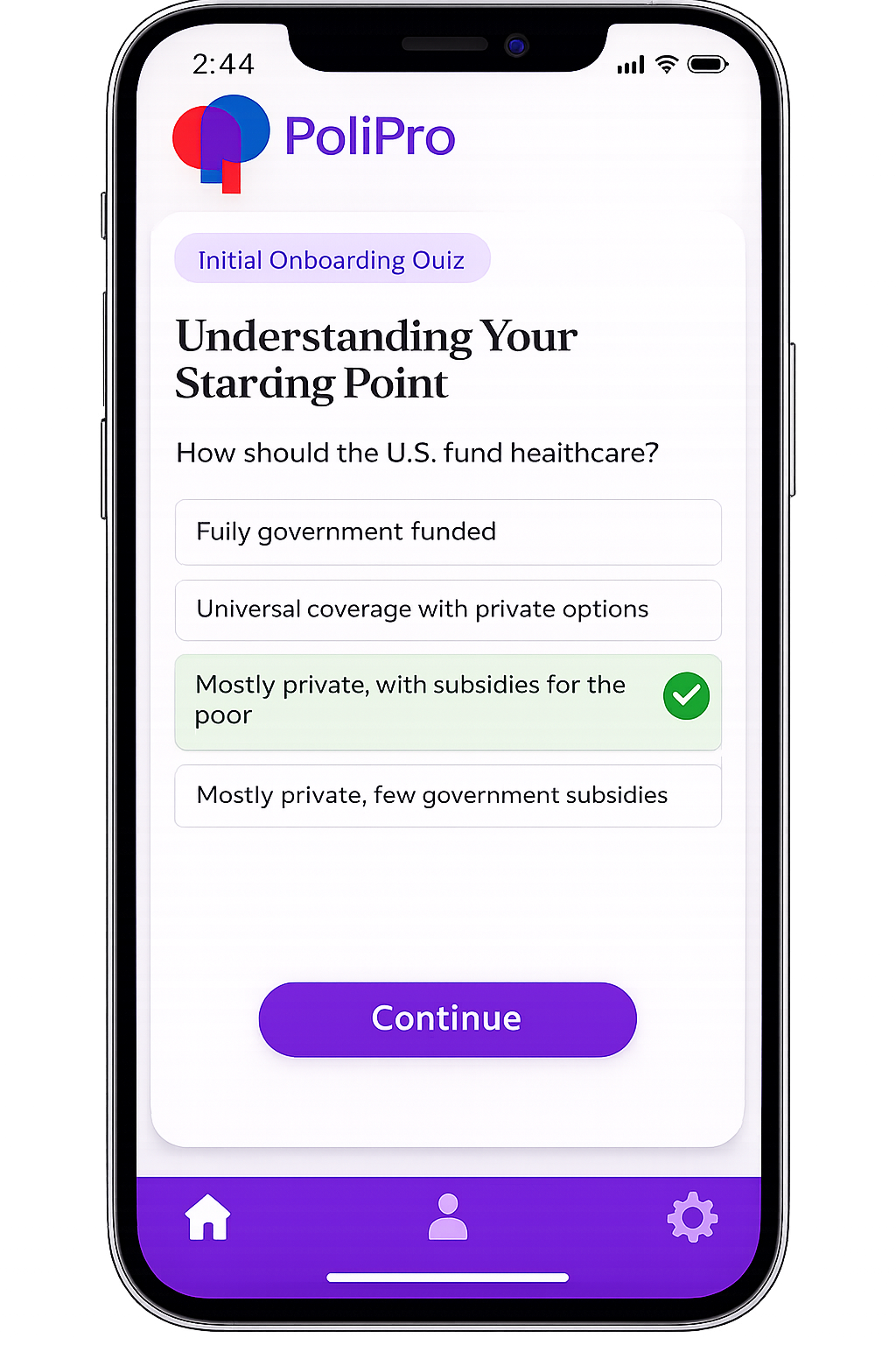 After the Entry Quiz, users receive an initial view of their political tendencies — not as a label, but as a directional insight. The screen highlights general lean patterns across a few core topics and introduces the idea that perspective is measurable and dynamic.